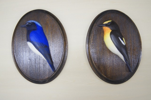 これまで体験教室は、伊豆高原の工房で、ペイントのみの体験でしたが、ご要望にお応えして、削ることもできる内容の体験をご用意しました。オオルリとキビタキの2種類ですが、半面を削って壁掛けの作品を作っていただきます。(写真を参考にしてください)