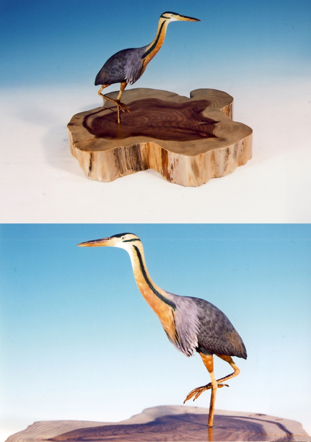 夕陽を背にしたムラサキサギを表現しました。台のヒバの木目を活かしてサギの影が伸びます。