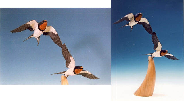 巣から落ちたツバメのヒナが工房に持ち込まれましたが、介護むなしくも落鳥してしまいました。そのヒナが成長して飛んでいるイメージを作品にしました。