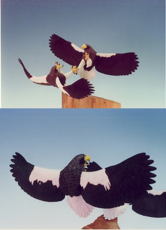 オオワシなど大型猛禽類は、空中で足をからめたディスプレイを行います。この作品はその一体感を出すため、一体で彫り上げています。